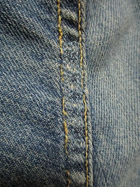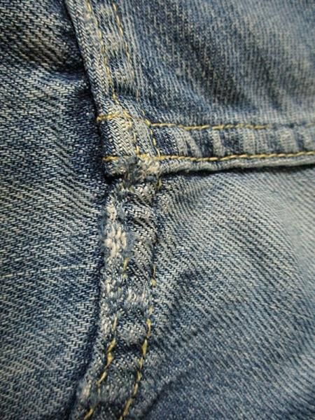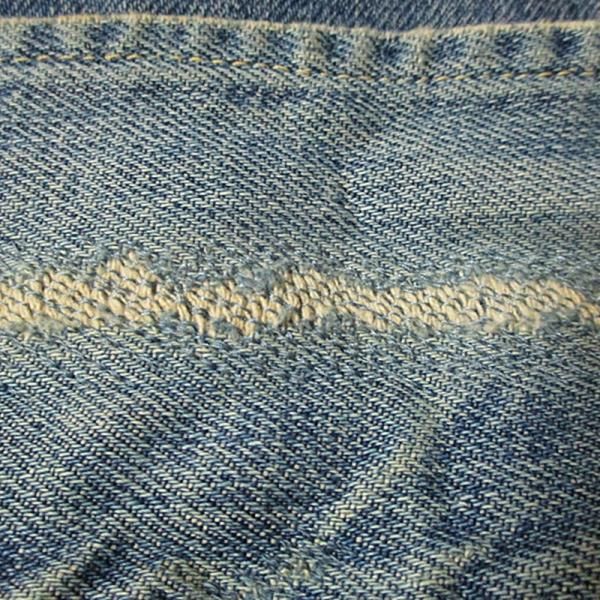襟 襟下 左袖 両袖手首 両カフス 両肩ヨークのダメージに普通地用の細い糸(60番手)でタタキリペア、両袖口切り込みスリット(スラッシュあき 切羽)部分のスレに手縫いブランケットステッチ補強、各部切り替えヨークのステッチ抜けと緩みに手縫い(30番手)およびミシン縫い(60番手)リステッチ、ウエストバンド 身頃前立て生地端のスレに拡大防止の補強ステッチが施されています。