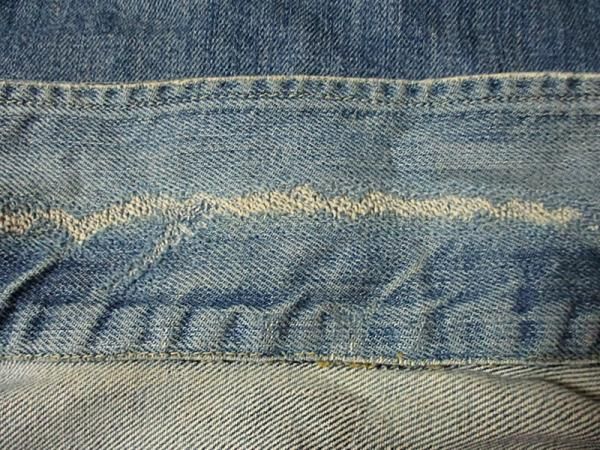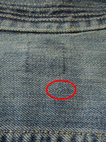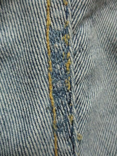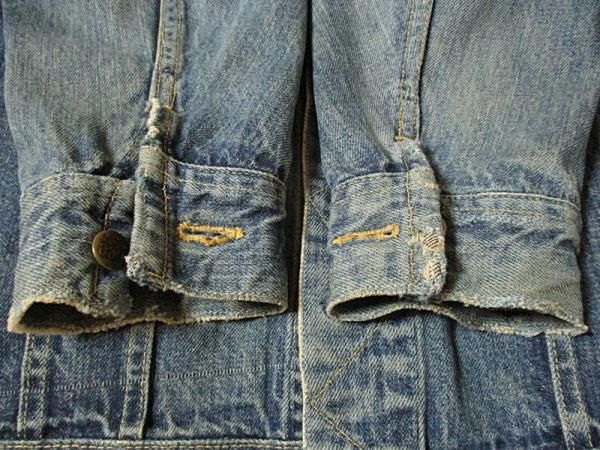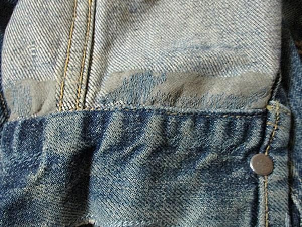 両袖に極僅かな汚れ(黄バミ)がありますが、ヴィンテージ慣れされた方でしたら「味」として許容いただけるレベルかと思います。全体的に色落ちは進行していますが、シャープな縦落ちが現れた程よい色落ち、風合いを生かしたリペア、非常に味のあるジャケットです。